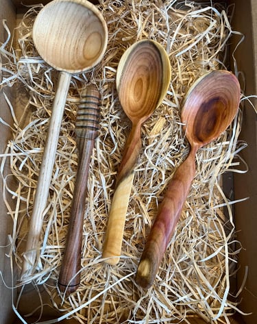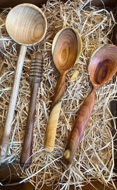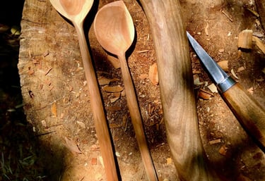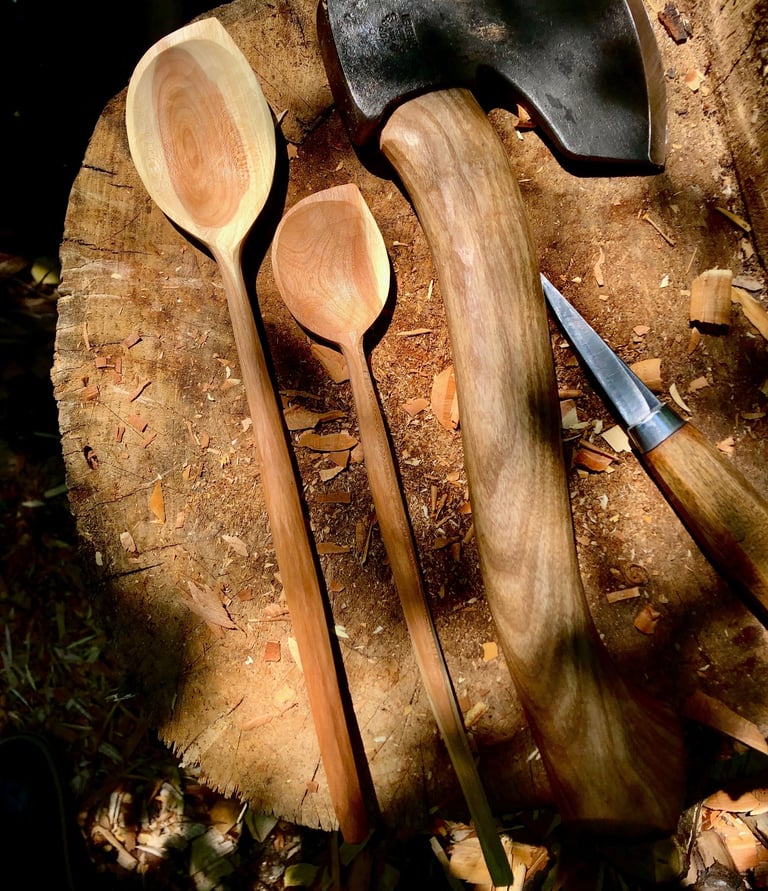 Ukázka ručně tesaných lžic a misek z dřeva našich stromů. Každý kus dřeva má svůj příběh.